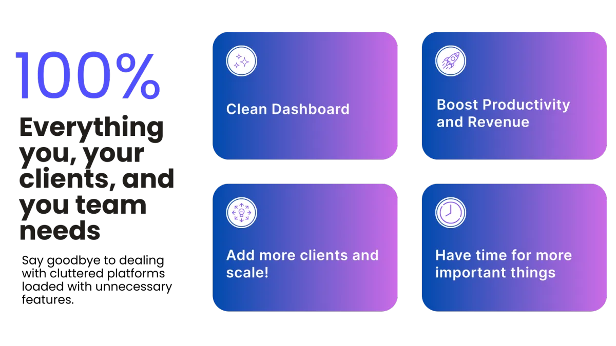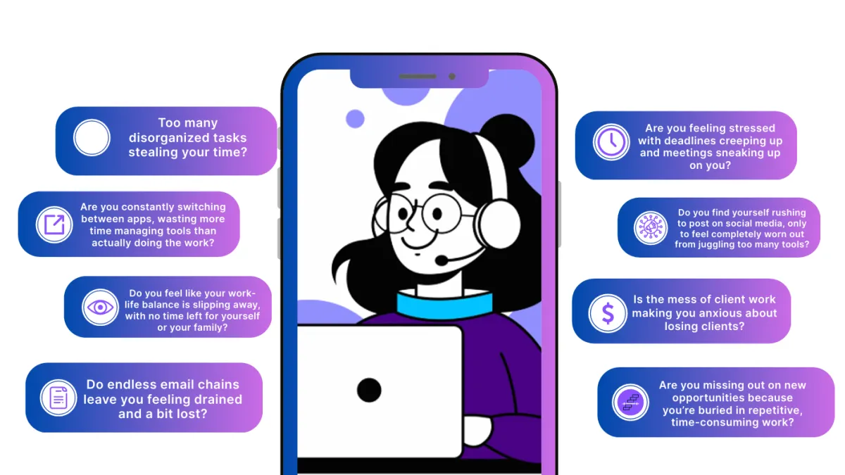 For Virtual Assistants, Freelancers, and Social Media Managers who dream of more clients, unsolicited referrals, and a life free from stress—this is your all in one tool.